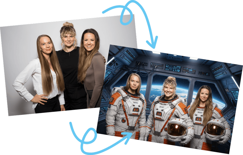 Naše AI fotobudka 2.0 přináší zcela nový zážitek z focení. Místo jednoduché výměny obličejů ve stejné scéně nyní využívá nejmodernější technologii, která vytváří celý snímek zcela nově. Z jediné fotky tak během 15 vteřin vznikne nová scéna – podobná té původní, ale vždy jedinečná. AI zvládne i více osob najednou, zachová jejich podobu a dokáže změnit oblečení, prostředí i celkový styl. Chcete se vidět jako postavy ze Simpsonových, astronauti nebo v době středověku? Stačí si vybrat.